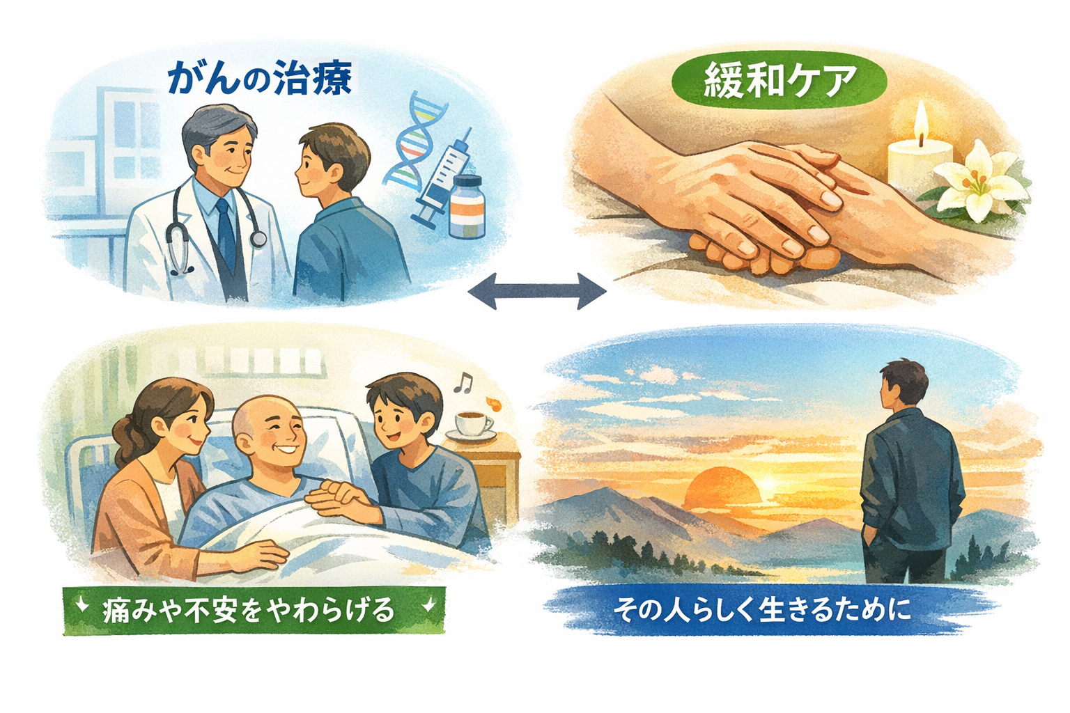 収録ではまず、緩和ケアが“特別なもの”ではなく、誰にとっても身近になり得ることが丁寧に語られます。さらに、治療の選択肢に向き合うときに陥りがちな「思い込み」をほどきながら、標準治療との向き合い方、そして治療が難しくなった後の時間をどう捉えるかへと話が深まっていきます。