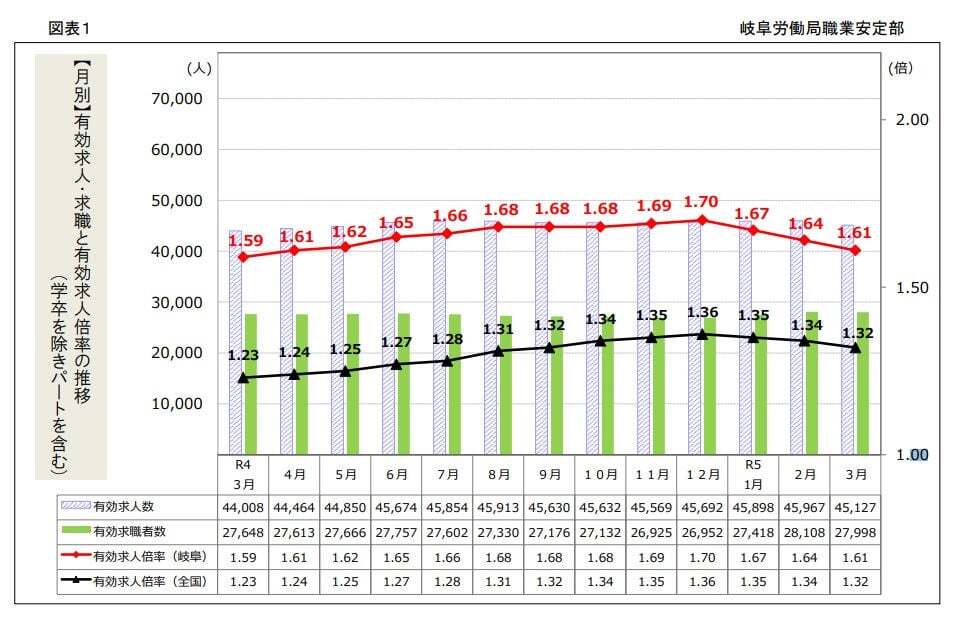 岐阜県の求人倍率は、2023年3月時点で1.61倍で全国平均の1.32倍より高い状況です。(全国3位)